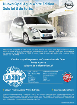 OPEN WEEKEND DI FINE ESTATECon la fine del periodo vacanziero riprendono i numerosi open weekend promossi dalle Case per proporre nuove versioni, modifiche di gamma e l’ormai onnipresente GPL. Tra i marchi commercializzati dalle aziende del Gruppo, segnaliamo le novità pubblicizzate a livello nazionale su stampa e TV. Ricco di fascino lo spot ambientato in Africa, che ha come protagonista l’elegante attore Richard Gere, testimonial di Lancia Delta sin dal suo debutto. Nel weekend del 19 e 20 settembre è stata proposta al pubblico la versione Executive. Tonalità bicolore del corpo vettura, cerchi in lega diamantati, rivestimenti in pelle Poltrona Frau per sedili e plancia, bracciolo anteriore con vano refrigerato e tetto apribile panoramico “Gran Luce” sono gli elementi che caratterizzano questa speciale versione spinta dal nuovo motore 1.8 TurboJet, che eroga una potenza massima di 200 Cv ed è il più performante della gamma. Sempre Lancia, sabato 12 e domenica 13 settembre ha promosso un open weekend dedicato alla e-collection con due limited edition per Musa e Ypsilon particolarmente attente al tema ecologico e dei consumi. Nello specifico, Ypsilon “eco” beneficia di ben 5.000 euro di ecoincentivi mentre Musa è dotata del dispositivo “Start & Stop” con il motore che si arresta ogni volta che il veicolo è fermo, e si riavvia con la ripresa della marcia. Come per Delta, anche in questo caso la pubblicità, che ha per protagonista una sirena - cenerentola vestita di verde, fa dell’eleganza e del fascino il suo punto forte. Nello stesso weekend del 12 e 13 settembre anche Alfa Romeo ha aperto le sue porte per riproporre la MiTo 1.4 Turbobenzina MultiAir, la rivoluzionaria tecnologia sviluppata e brevettata da FPT – Fiat Powertrain Technologies. Per MiTo, una vettura che ha avuto molto successo, soprattutto presso il pubblico più giovane e sportivo, una pubblicità televisiva all’insegna del divertimento con una versione del famoso videogame Space Invaders dove MiTo MultiAir è la protagonista. Per tutto il mese di settembre Ford ha invece proposto, a rotazione ogni fine settimana, offerte speciali su tutti i modelli in commercio, invitando il pubblico a recarsi in concessionaria per scoprire, in particolare, la gamma GPL e Metano. Open weekend sabato 19 e domenica 20 sia per Fiat Bravo, riproposta con impianto GPL Multi Injection progettato, fabbricato e garantito da Fiat e sia per la nuova gamma GPL Tech by Opel. Sempre Opel ha promosso, per tutto il mese di settembre, la campagna “Stop ai prezzi” con vantaggiose condizioni di acquisto su tutta la gamma. In particolare, nel weekend di sabato 26 e domenica 27 settembre, una vasta campagna via email ha invitato direttamente tutti gli iscritti alla newsletter elettronica Opel a recarsi in concessionaria per scoprire la nuova Opel Agila White Edition, disponibile al prezzo speciale di 9.200 Euro con rottamazione. |